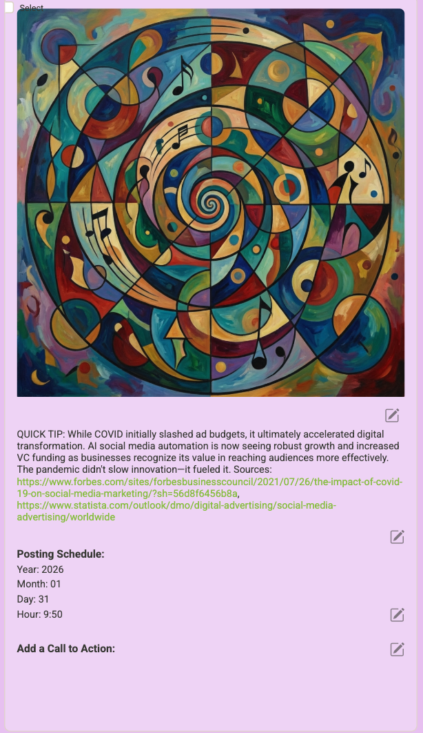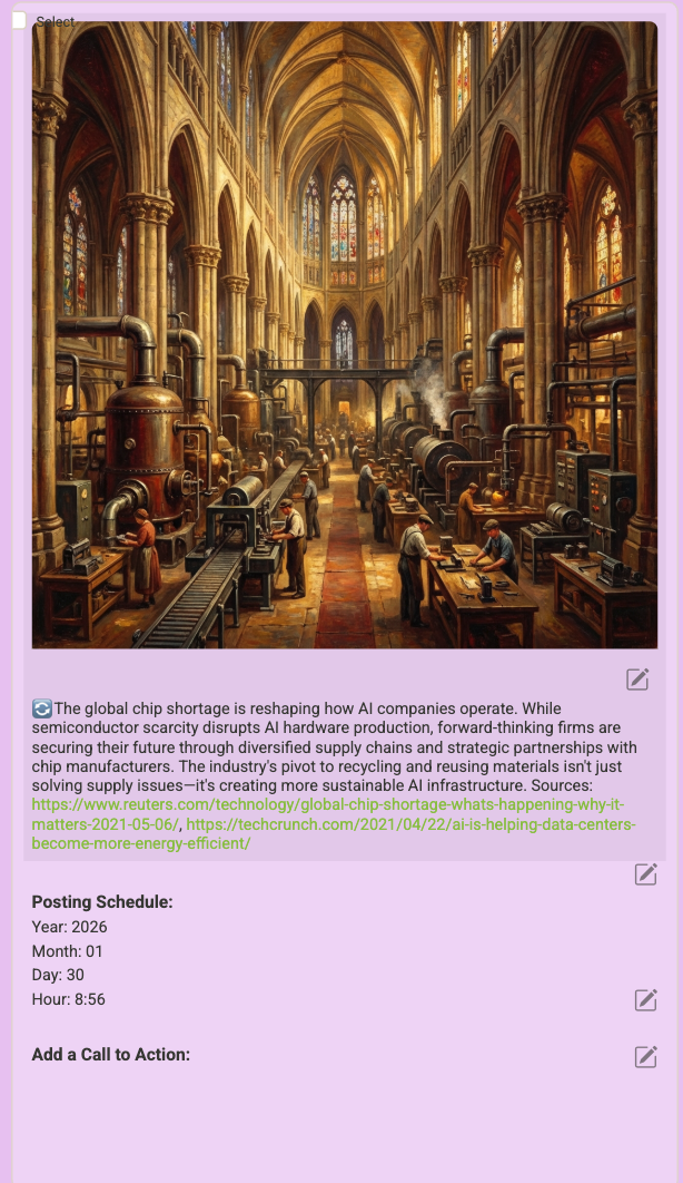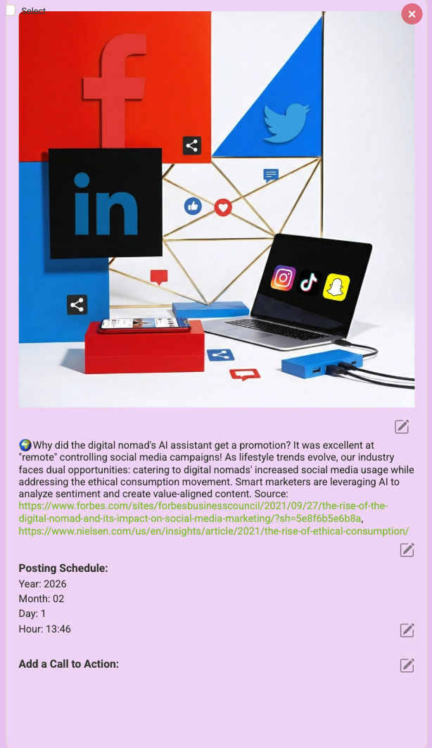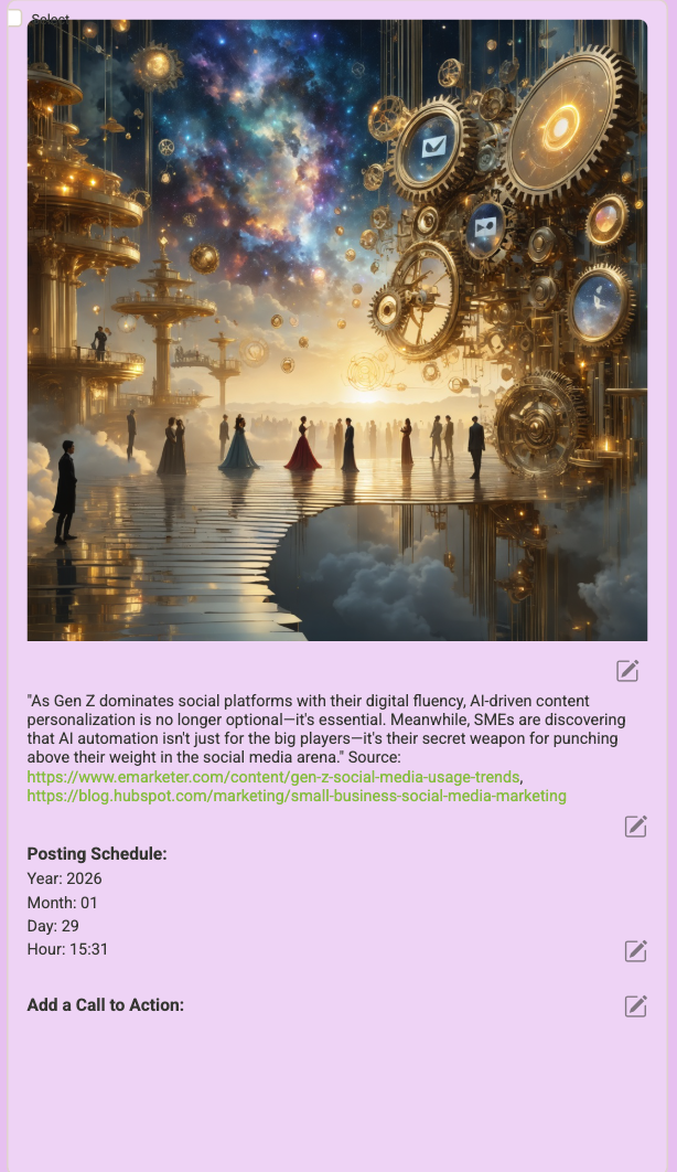 After the AI has created the initial posts, you can replace images and texts as well as edit to your liking before posting.
